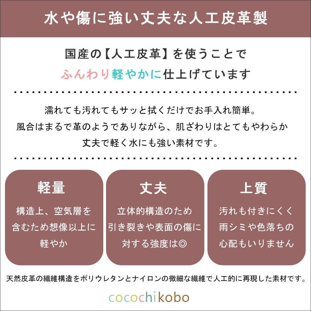 ポリウレタンとナイロンの微細な繊維で革の風合い、構造を再現した国産人工皮革。軽くて柔らかく手触りも心地いい素材。また、水にも強いので雨の日でぬれても安心。お手入れもさっと拭くだけで簡単。車のシートや家具にも使用されるとても丈夫な素材です。この素材感を活かしたデザインのバッグを作りたいと、仕様、持ち心地、ふんわり感など納得がいくまで試行錯誤を繰り返し出来上がったお財布です。cocochikoboでは使用時のことも考えて数ヶ月から一年、実際に毎日使ってみてから販売しています。